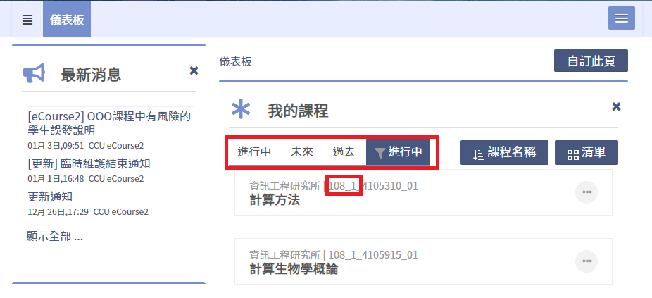 儀表板、課程列表
